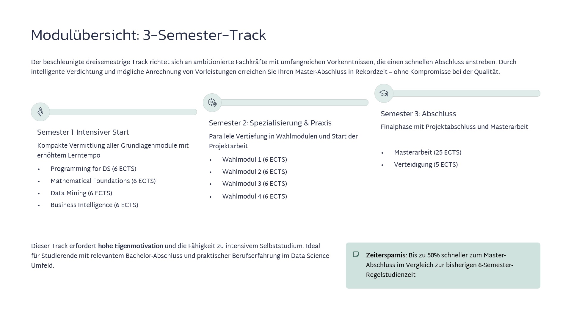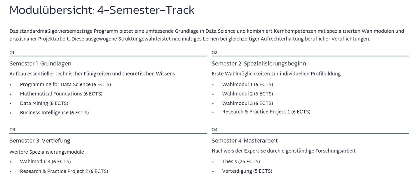 Mit diesem Masterprogramm legen Sie den Grundstein für eine Karriere in einem der dynamischsten und zukunftsträchtigsten Berufsfelder. Nutzen Sie die Chance, die Datenwelt aktiv mitzugestalten!