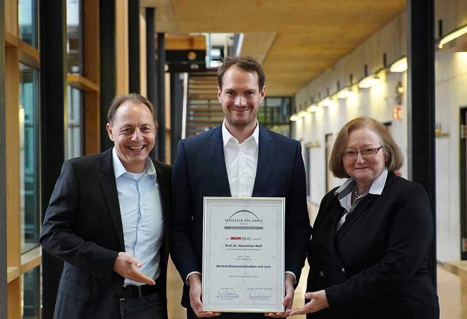 Albstadt/Sigmaringen. Relevantes Wissen vermitteln, Vorlesungen interessant gestalten, Brücken zwischen Studierenden und der Arbeitswelt bauen und eine gesunde Balance zwischen Anspruch und Spaß am Lernen herstellen: Mit diesen Erfolgsfaktoren ist Dr. Maximilian Wolf von der Hochschule Albstadt-Sigmaringen Professor des Jahres 2023 im gleichnamigen Wettbewerb der UNICUM Stiftung geworden. Der 41-Jährige lehrt im Bereich Betriebswirtschaft an der Fakultät Business Science and Management und landete dank seines großen Engagements für seine Studierenden in der Kategorie „Jura und Wirtschaftswissenschaften“ bundesweit auf dem zweiten Platz. Insgesamt traten in dieser Kategorie mehr als 200 Professorinnen und Professoren an.